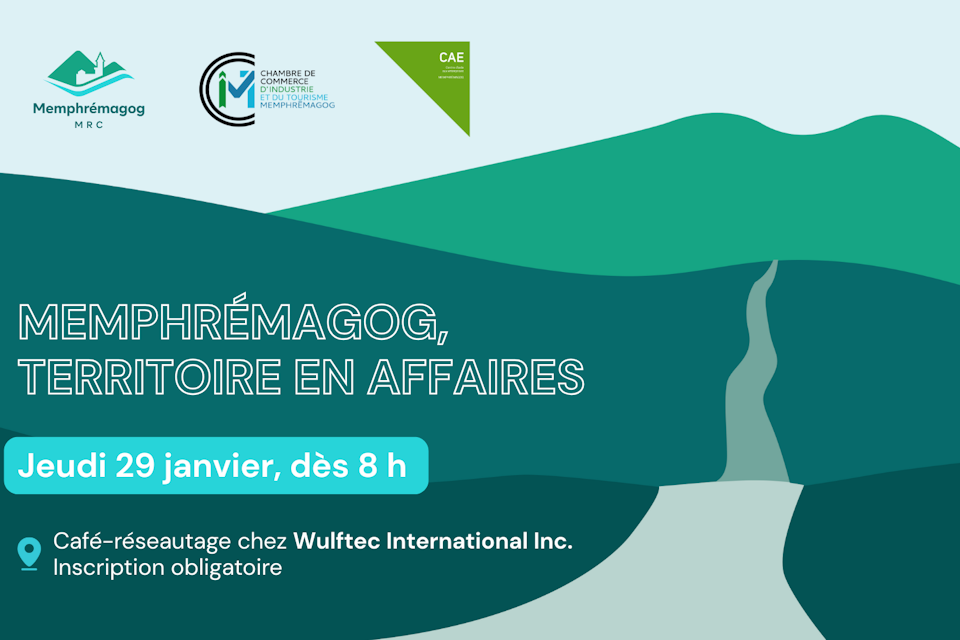 Le jeudi 29 janvier, dès 8 h, la MRC de Memphrémagog, la Chambre de commerce, d’industrie et de tourisme Memphrémagog ainsi que le CAE Memphrémagog invitent les entrepreneur·e·s de la région à un café réseautage chez Wulftec International Inc., dans le cadre de la série d’événements Memphrémagog, territoire en affaires.